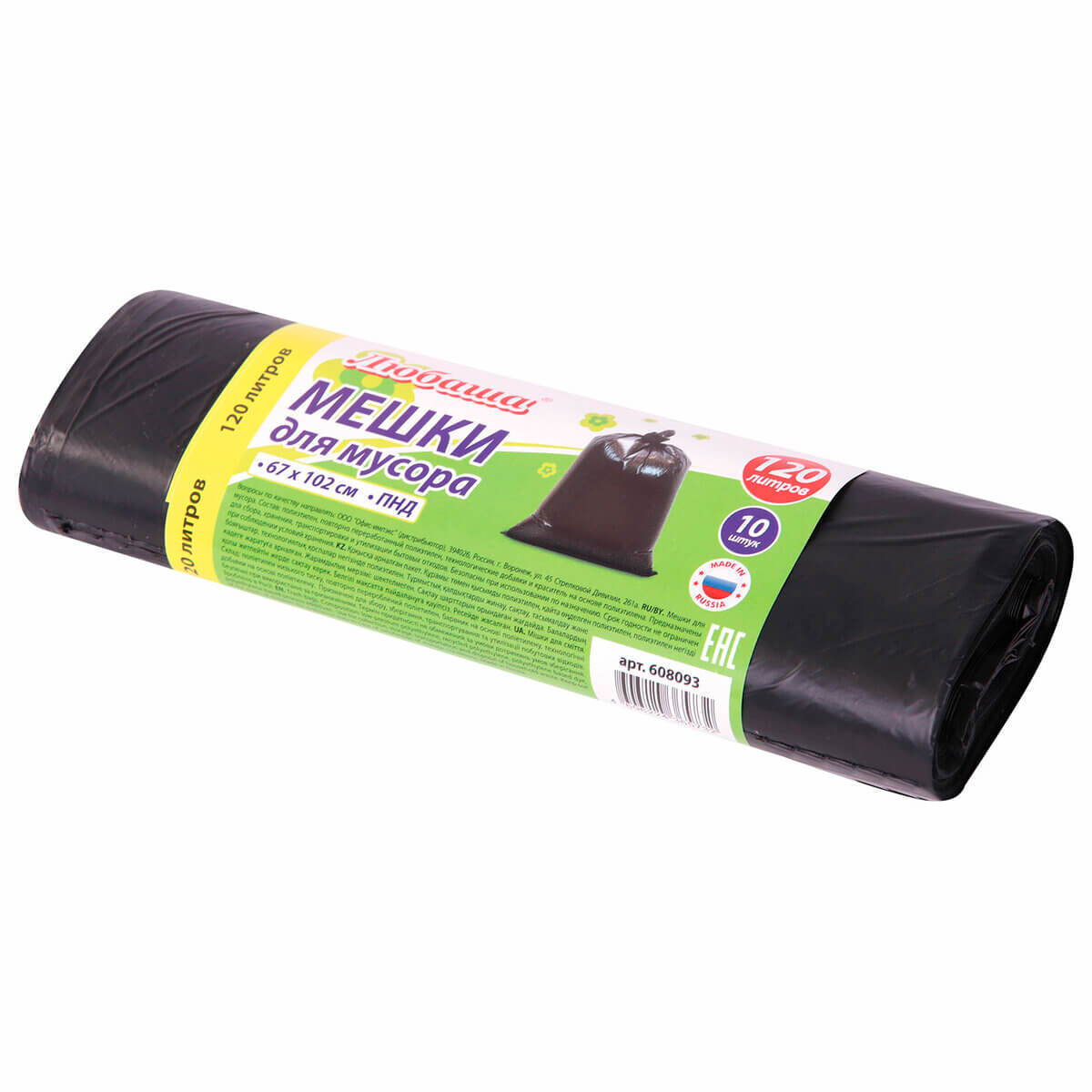 Мешки для мусора ЛЮБАША с объемом 120 литров и размером 67х102 см изготовлены из полиэтилена низкого давления (ПНД) с плотностью 11 микрон, что делает их прочными и надежными. Они предназначены для сбора, хранения, транспортировки и утилизации бытовых отходов, включая тяжелые.
