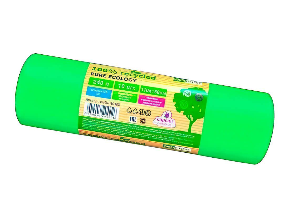 Мешки для мусора 240 л, ароматизированные, биоразлагаемые, зеленые, в рулоне 10 шт., ПВД 40 мкм, 1500х1100 мм, PURE ECOLOGY, bio24010120
