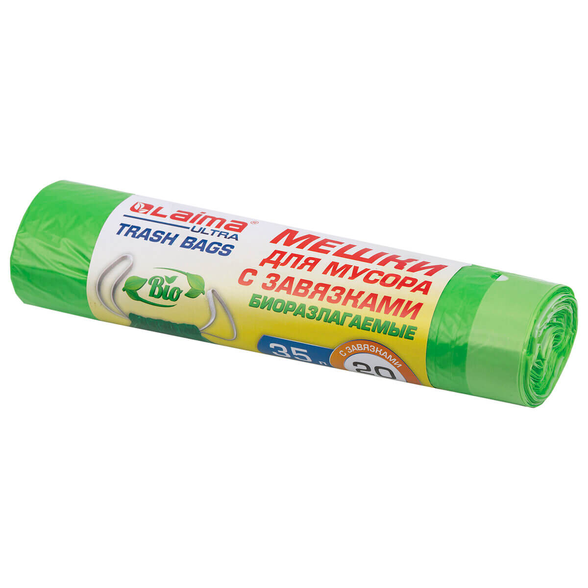 Мешки для мусора 35 л, биоразлагаемые с завязками, зеленые, в рулоне 20 шт., ПНД, 14 мкм, 600х500 мм, LAIMA ULTRA, 607688