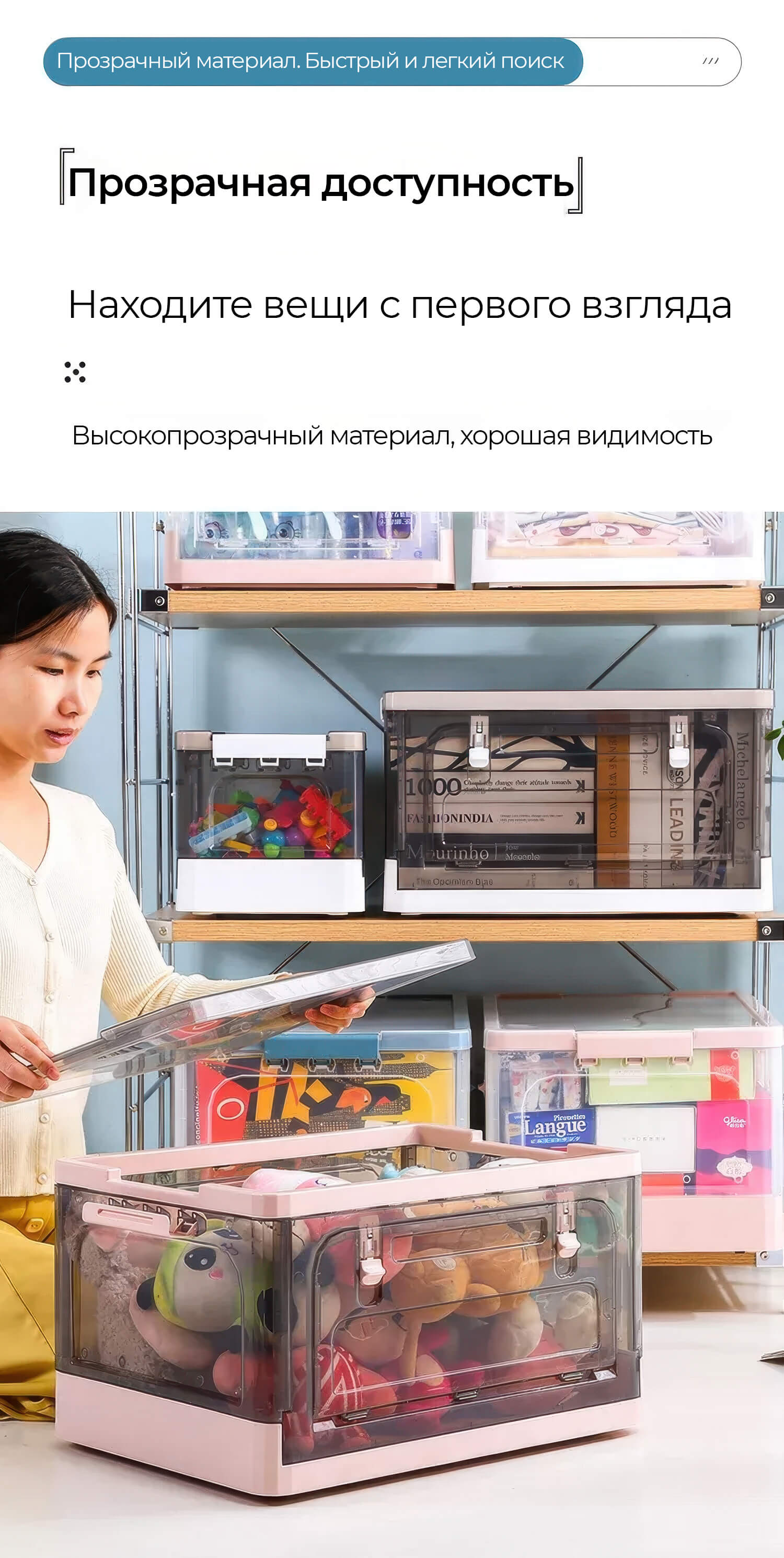 Пластиковая коробка с крышкой защищает вещи от пыли и влаги, а прочная конструкция обеспечивает долговечность даже при активном использовании. Колесики делают перемещение легким и удобным, а встроенная дверца на боковой стенке позволяет быстро получить доступ к содержимому, не снимая крышку. Складная конструкция экономит пространство, когда контейнер не используется.